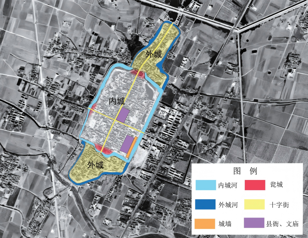昆阳古城布局图(作者自绘,底图为20世纪60年代昆阳古城卫星图)