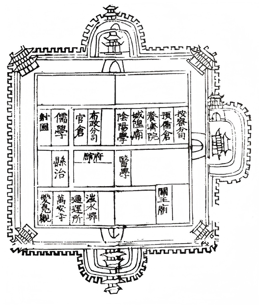 嘉靖时期,昆阳城北部的建筑有双凫观、万安寺、递运所、滍水驿、关王庙。其中,递运所是负责递送官方物资或军需的机构。滍水驿是当时叶县的两所驿站之一,也是明代南阳府最北端的驿站,建于明正统四年(1439),嘉靖时为滍水马驿,设驿丞一人。中北部的建筑有县治、府馆、医学。县治即县衙,府馆是客舍,供往来客商住宿,医学即官方的医学校。中南部的建筑有射圃、儒学、官仓、布政分司、阴阳学、城隍庙、养济院、预备仓、按察分司。射圃是举行乡射礼之处,儒学即县学和文庙。官仓、预备仓是仓储设施。布政分司、按察分司是行政机构。阴阳学是教授天文、历法、数术等知识的学校。养济院是救济机构。南部无特别注明的建设,应以民居为主。可以看出,嘉靖时期的昆阳城北部以庙宇为主,中北、中南以官署为主,南部则是普通居民区。